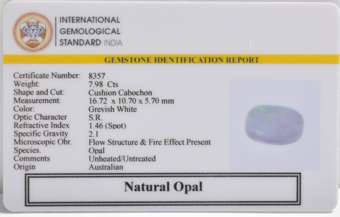 Beautiful 7.98 Cts Natural Opal (AAA-Mines) sva 8+ Ratti OPAL. Free Horoscope & Free Pundit Ji Astrological Advise / Consultation. Original Natural Lab certified gems by IGI GTL / Birth stones / Large Gem Selection of shree shubh Rashi Ratan Vedic dhan at Gem Mines. May Bhagwan Brahma, Vishnu, Shiv & Universe bless you.