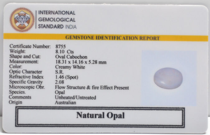 Beautiful 8.1 Cts Natural Opal (AAA+-Mines) sva 9+ Ratti OPAL. Free Horoscope & Free Pundit Ji Astrological Advise / Consultation. Original Natural Lab certified gems by IGI GTL / Birth stones / Large Gem Selection of shree shubh Rashi Ratan Vedic dhan at Gem Mines. May Bhagwan Brahma, Vishnu, Shiv & Universe bless you.