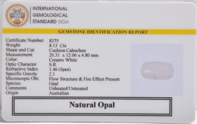 Beautiful 8.13 Cts Natural Opal (Good-Mines) sva 9+ Ratti OPAL. Free Horoscope & Free Pundit Ji Astrological Advise / Consultation. Original Natural Lab certified gems by IGI GTL / Birth stones / Large Gem Selection of shree shubh Rashi Ratan Vedic dhan at Gem Mines. May Bhagwan Brahma, Vishnu, Shiv & Universe bless you.
