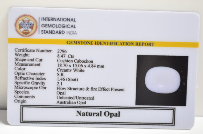Beautiful 8.47 Cts Natural Opal (AAA+-Mines) sva 9+ Ratti OPAL. Free Horoscope & Free Pundit Ji Astrological Advise / Consultation. Original Natural Lab certified gems by IGI GTL / Birth stones / Large Gem Selection of shree shubh Rashi Ratan Vedic dhan at Gem Mines. May Bhagwan Brahma, Vishnu, Shiv & Universe bless you.