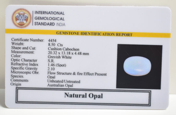 Beautiful 8.5 Cts Natural Opal (AAA+-Mines) sva 9+ Ratti OPAL. Free Horoscope & Free Pundit Ji Astrological Advise / Consultation. Original Natural Lab certified gems by IGI GTL / Birth stones / Large Gem Selection of shree shubh Rashi Ratan Vedic dhan at Gem Mines. May Bhagwan Brahma, Vishnu, Shiv & Universe bless you.