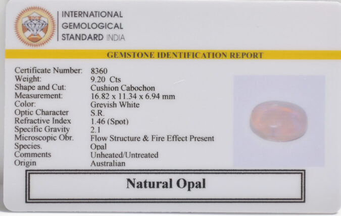 Beautiful 9.2 Cts Natural Opal (Good-Mines) sva 10+ Ratti OPAL. Free Horoscope & Free Pundit Ji Astrological Advise / Consultation. Original Natural Lab certified gems by IGI GTL / Birth stones / Large Gem Selection of shree shubh Rashi Ratan Vedic dhan at Gem Mines. May Bhagwan Brahma, Vishnu, Shiv & Universe bless you.