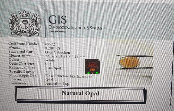 Beautiful 9.2 Ct. Opal (Australian Mines) Sava 10 Ratti Opal. Free Horoscope & Free Pundit Ji Advise / Consultation. Original Natural Lab certified gems by GIS / Birth stones / Large Gem Selection of shree shubh Rashi Ratan Vedic dhan at Gem Mines. May Bhagwan Brahma, Vishnu, Shiv & Universe bless you.