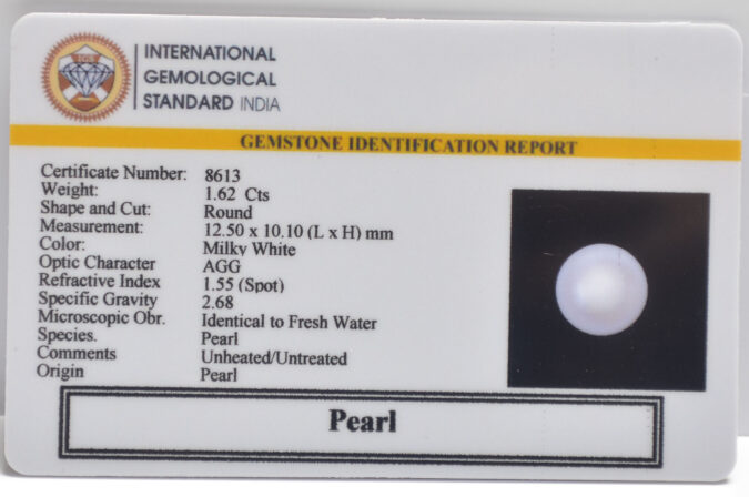 Beautiful 1.62 Cts Pearl (AAA-Mines) sva 1+ Ratti PEARL. Free Horoscope & Free Pundit Ji Astrological Advise / Consultation. Original Natural Lab certified gems by IGI GTL / Birth stones / Large Gem Selection of shree shubh Rashi Ratan Vedic dhan at Gem Mines. May Bhagwan Brahma, Vishnu, Shiv & Universe bless you.