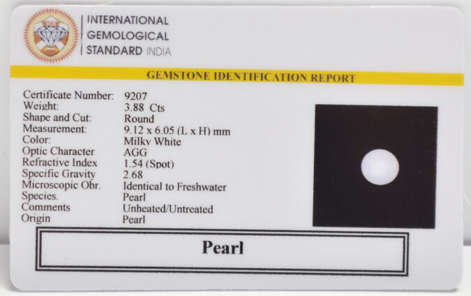 Beautiful 3.88 Cts Pearl (AAA+-Mines) sva 4+ Ratti PEARL. Free Horoscope & Free Pundit Ji Astrological Advise / Consultation. Original Natural Lab certified gems by IGI GTL / Birth stones / Large Gem Selection of shree shubh Rashi Ratan Vedic dhan at Gem Mines. May Bhagwan Brahma, Vishnu, Shiv & Universe bless you.