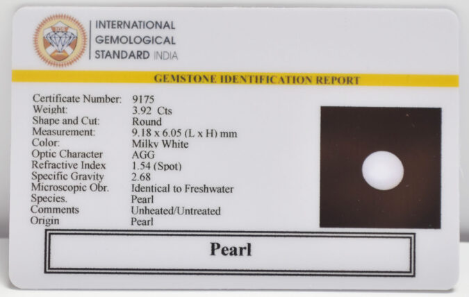 Beautiful 3.92 Cts Pearl (AAA+-Mines) sva 4+ Ratti PEARL. Free Horoscope & Free Pundit Ji Astrological Advise / Consultation. Original Natural Lab certified gems by IGI GTL / Birth stones / Large Gem Selection of shree shubh Rashi Ratan Vedic dhan at Gem Mines. May Bhagwan Brahma, Vishnu, Shiv & Universe bless you.