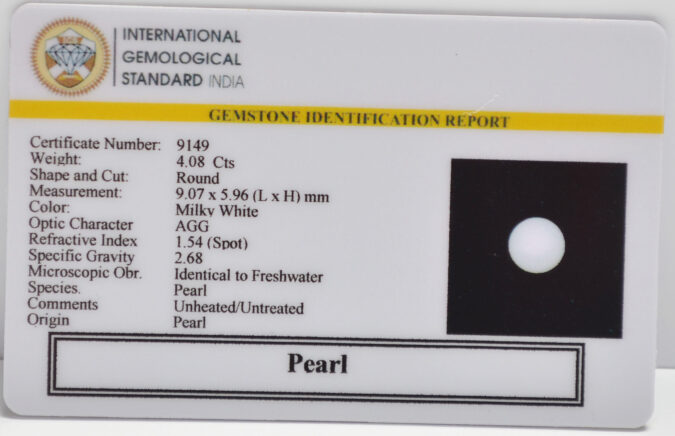 Beautiful 4.08 Cts Pearl (AAA+-Mines) sva 4+ Ratti PEARL. Free Horoscope & Free Pundit Ji Astrological Advise / Consultation. Original Natural Lab certified gems by IGI GTL / Birth stones / Large Gem Selection of shree shubh Rashi Ratan Vedic dhan at Gem Mines. May Bhagwan Brahma, Vishnu, Shiv & Universe bless you.