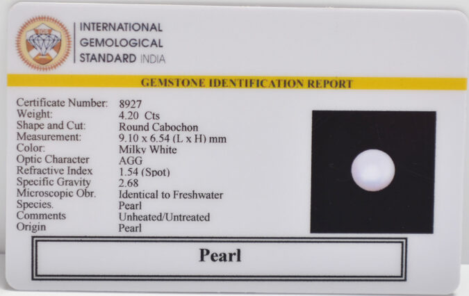 Beautiful 4.2 Cts Pearl (AAA+-Mines) sva 4+ Ratti PEARL. Free Horoscope & Free Pundit Ji Astrological Advise / Consultation. Original Natural Lab certified gems by IGI GTL / Birth stones / Large Gem Selection of shree shubh Rashi Ratan Vedic dhan at Gem Mines. May Bhagwan Brahma, Vishnu, Shiv & Universe bless you.