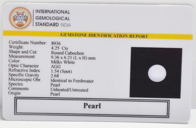 Beautiful 4.25 Cts Pearl (AAA+-Mines) sva 4+ Ratti PEARL. Free Horoscope & Free Pundit Ji Astrological Advise / Consultation. Original Natural Lab certified gems by IGI GTL / Birth stones / Large Gem Selection of shree shubh Rashi Ratan Vedic dhan at Gem Mines. May Bhagwan Brahma, Vishnu, Shiv & Universe bless you.