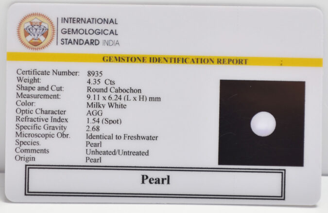 Beautiful 4.35 Cts Pearl (AAA-Mines) sva 4+ Ratti PEARL. Free Horoscope & Free Pundit Ji Astrological Advise / Consultation. Original Natural Lab certified gems by IGI GTL / Birth stones / Large Gem Selection of shree shubh Rashi Ratan Vedic dhan at Gem Mines. May Bhagwan Brahma, Vishnu, Shiv & Universe bless you.