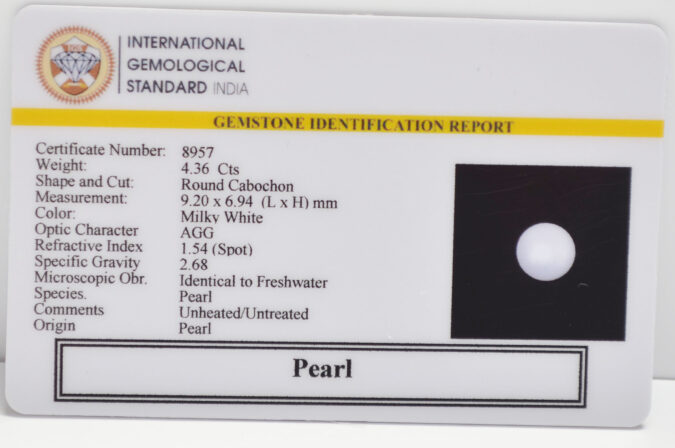 Beautiful 4.36 Cts Pearl (AAA+-Mines) sva 4+ Ratti PEARL. Free Horoscope & Free Pundit Ji Astrological Advise / Consultation. Original Natural Lab certified gems by IGI GTL / Birth stones / Large Gem Selection of shree shubh Rashi Ratan Vedic dhan at Gem Mines. May Bhagwan Brahma, Vishnu, Shiv & Universe bless you.