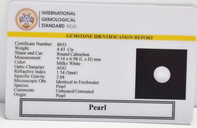 Beautiful 4.43 Cts Pearl (AAA+-Mines) sva 4+ Ratti PEARL. Free Horoscope & Free Pundit Ji Astrological Advise / Consultation. Original Natural Lab certified gems by IGI GTL / Birth stones / Large Gem Selection of shree shubh Rashi Ratan Vedic dhan at Gem Mines. May Bhagwan Brahma, Vishnu, Shiv & Universe bless you.