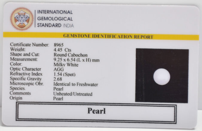 Beautiful 4.45 Cts Pearl (AAA+-Mines) sva 4+ Ratti PEARL. Free Horoscope & Free Pundit Ji Astrological Advise / Consultation. Original Natural Lab certified gems by IGI GTL / Birth stones / Large Gem Selection of shree shubh Rashi Ratan Vedic dhan at Gem Mines. May Bhagwan Brahma, Vishnu, Shiv & Universe bless you.