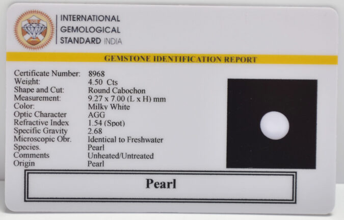 Beautiful 4.5 Cts Pearl (AAA-Mines) sva 5+ Ratti PEARL. Free Horoscope & Free Pundit Ji Astrological Advise / Consultation. Original Natural Lab certified gems by IGI GTL / Birth stones / Large Gem Selection of shree shubh Rashi Ratan Vedic dhan at Gem Mines. May Bhagwan Brahma, Vishnu, Shiv & Universe bless you.