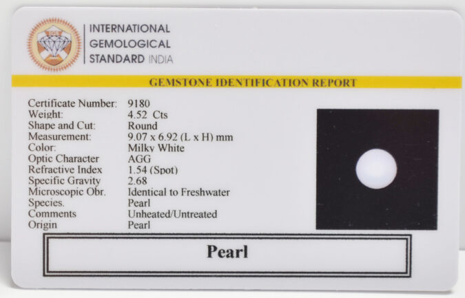 Beautiful 4.52 Cts Pearl (AAA+-Mines) sva 5+ Ratti PEARL. Free Horoscope & Free Pundit Ji Astrological Advise / Consultation. Original Natural Lab certified gems by IGI GTL / Birth stones / Large Gem Selection of shree shubh Rashi Ratan Vedic dhan at Gem Mines. May Bhagwan Brahma, Vishnu, Shiv & Universe bless you.