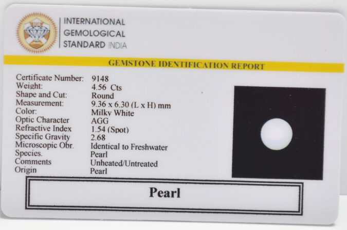 Beautiful 4.56 Cts Pearl (AAA+-Mines) sva 5+ Ratti PEARL. Free Horoscope & Free Pundit Ji Astrological Advise / Consultation. Original Natural Lab certified gems by IGI GTL / Birth stones / Large Gem Selection of shree shubh Rashi Ratan Vedic dhan at Gem Mines. May Bhagwan Brahma, Vishnu, Shiv & Universe bless you.
