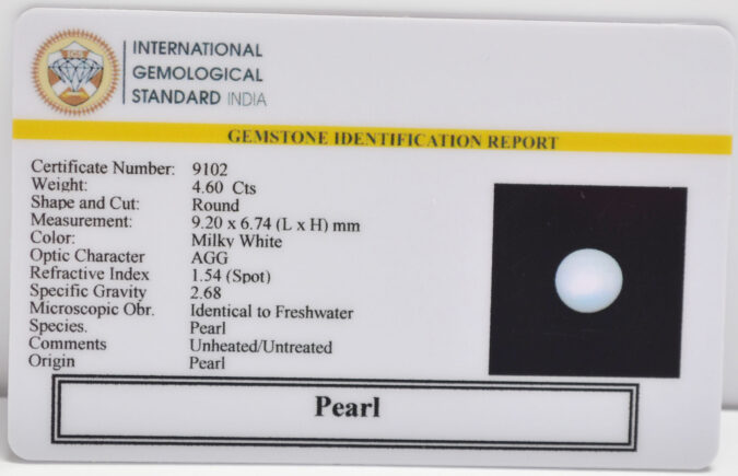 Beautiful 4.6 Cts Pearl (AAA+-Mines) sva 5+ Ratti PEARL. Free Horoscope & Free Pundit Ji Astrological Advise / Consultation. Original Natural Lab certified gems by IGI GTL / Birth stones / Large Gem Selection of shree shubh Rashi Ratan Vedic dhan at Gem Mines. May Bhagwan Brahma, Vishnu, Shiv & Universe bless you.
