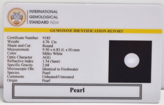 Beautiful 4.76 Cts Pearl (AAA+-Mines) sva 5+ Ratti PEARL. Free Horoscope & Free Pundit Ji Astrological Advise / Consultation. Original Natural Lab certified gems by IGI GTL / Birth stones / Large Gem Selection of shree shubh Rashi Ratan Vedic dhan at Gem Mines. May Bhagwan Brahma, Vishnu, Shiv & Universe bless you.