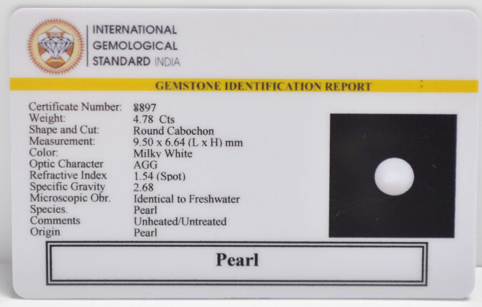 Beautiful 4.78 Cts Pearl (AAA-Mines) sva 5+ Ratti PEARL. Free Horoscope & Free Pundit Ji Astrological Advise / Consultation. Original Natural Lab certified gems by IGI GTL / Birth stones / Large Gem Selection of shree shubh Rashi Ratan Vedic dhan at Gem Mines. May Bhagwan Brahma, Vishnu, Shiv & Universe bless you.
