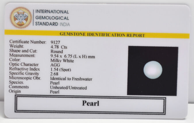 Beautiful 4.78 Cts Pearl (AAA+-Mines) sva 5+ Ratti PEARL. Free Horoscope & Free Pundit Ji Astrological Advise / Consultation. Original Natural Lab certified gems by IGI GTL / Birth stones / Large Gem Selection of shree shubh Rashi Ratan Vedic dhan at Gem Mines. May Bhagwan Brahma, Vishnu, Shiv & Universe bless you.