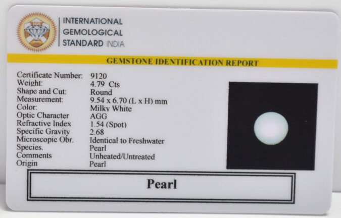 Beautiful 4.79 Cts Pearl (AAA+-Mines) sva 5+ Ratti PEARL. Free Horoscope & Free Pundit Ji Astrological Advise / Consultation. Original Natural Lab certified gems by IGI GTL / Birth stones / Large Gem Selection of shree shubh Rashi Ratan Vedic dhan at Gem Mines. May Bhagwan Brahma, Vishnu, Shiv & Universe bless you.