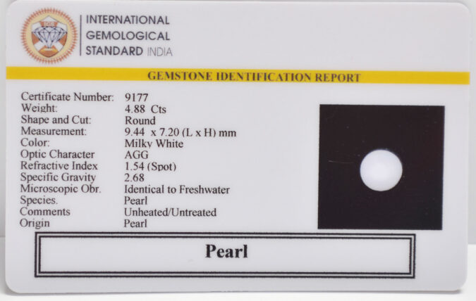 Beautiful 4.88 Cts Pearl (AAA+-Mines) sva 5+ Ratti PEARL. Free Horoscope & Free Pundit Ji Astrological Advise / Consultation. Original Natural Lab certified gems by IGI GTL / Birth stones / Large Gem Selection of shree shubh Rashi Ratan Vedic dhan at Gem Mines. May Bhagwan Brahma, Vishnu, Shiv & Universe bless you.