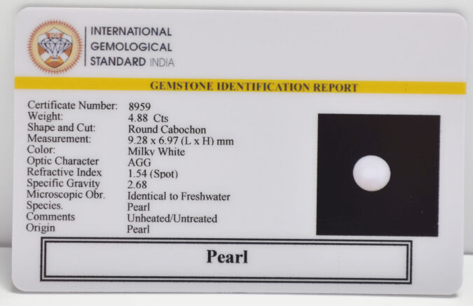 Beautiful 4.88 Cts Pearl (AAA-Mines) sva 5+ Ratti PEARL. Free Horoscope & Free Pundit Ji Astrological Advise / Consultation. Original Natural Lab certified gems by IGI GTL / Birth stones / Large Gem Selection of shree shubh Rashi Ratan Vedic dhan at Gem Mines. May Bhagwan Brahma, Vishnu, Shiv & Universe bless you.