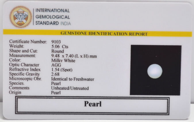 Beautiful 5.06 Cts Pearl (AAA+-Mines) sva 5+ Ratti PEARL. Free Horoscope & Free Pundit Ji Astrological Advise / Consultation. Original Natural Lab certified gems by IGI GTL / Birth stones / Large Gem Selection of shree shubh Rashi Ratan Vedic dhan at Gem Mines. May Bhagwan Brahma, Vishnu, Shiv & Universe bless you.