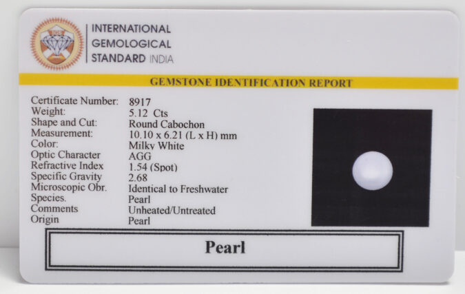 Beautiful 5.12 Cts Pearl (AAA-Mines) sva 5+ Ratti PEARL. Free Horoscope & Free Pundit Ji Astrological Advise / Consultation. Original Natural Lab certified gems by IGI GTL / Birth stones / Large Gem Selection of shree shubh Rashi Ratan Vedic dhan at Gem Mines. May Bhagwan Brahma, Vishnu, Shiv & Universe bless you.