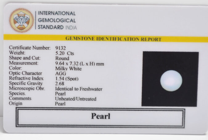 Beautiful 5.2 Cts Pearl (AAA+-Mines) sva 5+ Ratti PEARL. Free Horoscope & Free Pundit Ji Astrological Advise / Consultation. Original Natural Lab certified gems by IGI GTL / Birth stones / Large Gem Selection of shree shubh Rashi Ratan Vedic dhan at Gem Mines. May Bhagwan Brahma, Vishnu, Shiv & Universe bless you.
