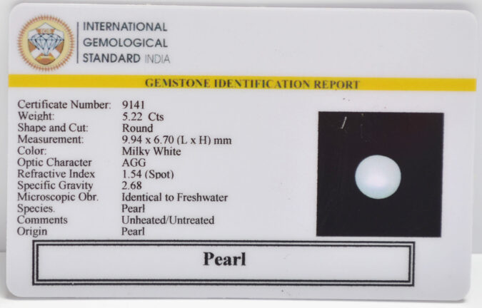 Beautiful 5.22 Cts Pearl (AAA-Mines) sva 5+ Ratti PEARL. Free Horoscope & Free Pundit Ji Astrological Advise / Consultation. Original Natural Lab certified gems by IGI GTL / Birth stones / Large Gem Selection of shree shubh Rashi Ratan Vedic dhan at Gem Mines. May Bhagwan Brahma, Vishnu, Shiv & Universe bless you.