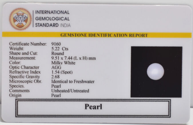 Beautiful 5.22 Cts Pearl (AAA+-Mines) sva 5+ Ratti PEARL. Free Horoscope & Free Pundit Ji Astrological Advise / Consultation. Original Natural Lab certified gems by IGI GTL / Birth stones / Large Gem Selection of shree shubh Rashi Ratan Vedic dhan at Gem Mines. May Bhagwan Brahma, Vishnu, Shiv & Universe bless you.