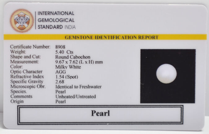 Beautiful 5.4 Cts Pearl (AAA+-Mines) sva 6+ Ratti PEARL. Free Horoscope & Free Pundit Ji Astrological Advise / Consultation. Original Natural Lab certified gems by IGI GTL / Birth stones / Large Gem Selection of shree shubh Rashi Ratan Vedic dhan at Gem Mines. May Bhagwan Brahma, Vishnu, Shiv & Universe bless you.
