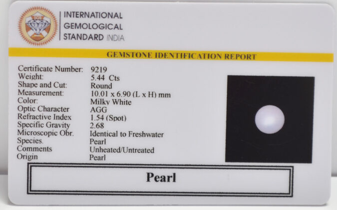 Beautiful 5.44 Cts Pearl (AAA+-Mines) sva 6+ Ratti PEARL. Free Horoscope & Free Pundit Ji Astrological Advise / Consultation. Original Natural Lab certified gems by IGI GTL / Birth stones / Large Gem Selection of shree shubh Rashi Ratan Vedic dhan at Gem Mines. May Bhagwan Brahma, Vishnu, Shiv & Universe bless you.