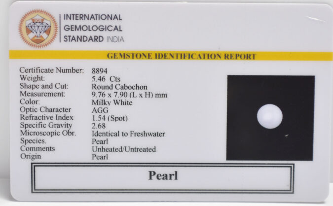 Beautiful 5.46 Cts Pearl (AAA+-Mines) sva 6+ Ratti PEARL. Free Horoscope & Free Pundit Ji Astrological Advise / Consultation. Original Natural Lab certified gems by IGI GTL / Birth stones / Large Gem Selection of shree shubh Rashi Ratan Vedic dhan at Gem Mines. May Bhagwan Brahma, Vishnu, Shiv & Universe bless you.
