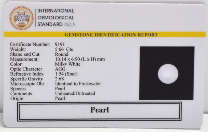 Beautiful 5.66 Cts Pearl (AAA+-Mines) sva 6+ Ratti PEARL. Free Horoscope & Free Pundit Ji Astrological Advise / Consultation. Original Natural Lab certified gems by IGI GTL / Birth stones / Large Gem Selection of shree shubh Rashi Ratan Vedic dhan at Gem Mines. May Bhagwan Brahma, Vishnu, Shiv & Universe bless you.