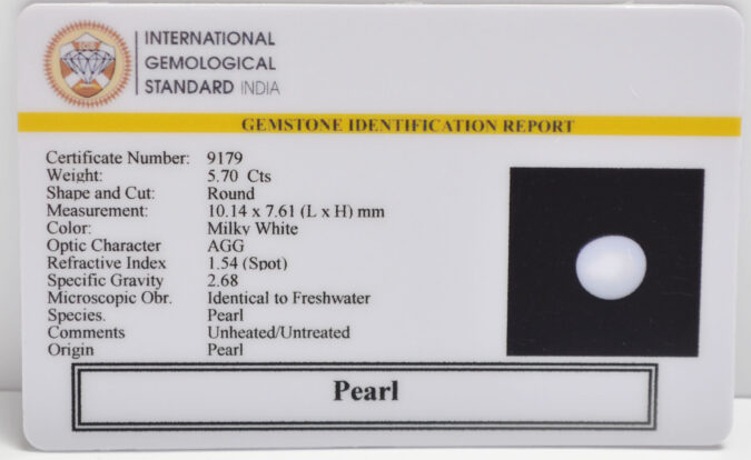 Beautiful 5.7 Cts Pearl (AAA+-Mines) sva 6+ Ratti PEARL. Free Horoscope & Free Pundit Ji Astrological Advise / Consultation. Original Natural Lab certified gems by IGI GTL / Birth stones / Large Gem Selection of shree shubh Rashi Ratan Vedic dhan at Gem Mines. May Bhagwan Brahma, Vishnu, Shiv & Universe bless you.