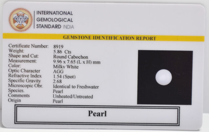 Beautiful 5.86 Cts Pearl (AAA+-Mines) sva 6+ Ratti PEARL. Free Horoscope & Free Pundit Ji Astrological Advise / Consultation. Original Natural Lab certified gems by IGI GTL / Birth stones / Large Gem Selection of shree shubh Rashi Ratan Vedic dhan at Gem Mines. May Bhagwan Brahma, Vishnu, Shiv & Universe bless you.