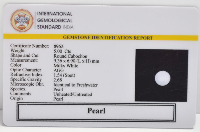 Beautiful 5 Cts Pearl (AAA+-Mines) sva 5+ Ratti PEARL. Free Horoscope & Free Pundit Ji Astrological Advise / Consultation. Original Natural Lab certified gems by IGI GTL / Birth stones / Large Gem Selection of shree shubh Rashi Ratan Vedic dhan at Gem Mines. May Bhagwan Brahma, Vishnu, Shiv & Universe bless you.