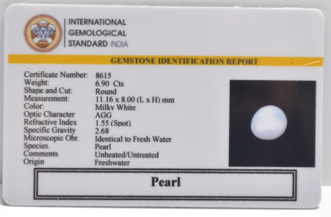 Beautiful 6.9 Cts Fresh Water (AAA-Mines) sva 7+ Ratti PEARL. Free Horoscope & Free Pundit Ji Astrological Advise / Consultation. Original Natural Lab certified gems by IGI GTL / Birth stones / Large Gem Selection of shree shubh Rashi Ratan Vedic dhan at Gem Mines. May Bhagwan Brahma, Vishnu, Shiv & Universe bless you.