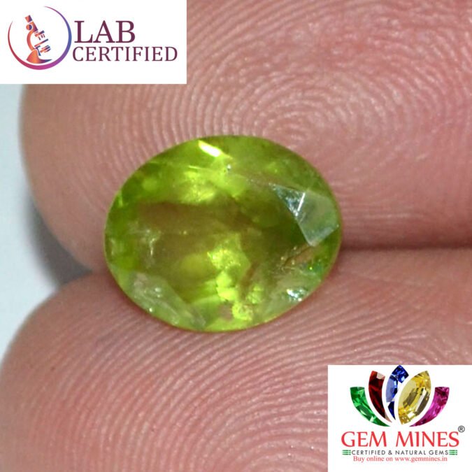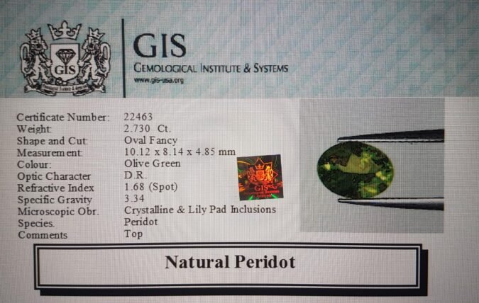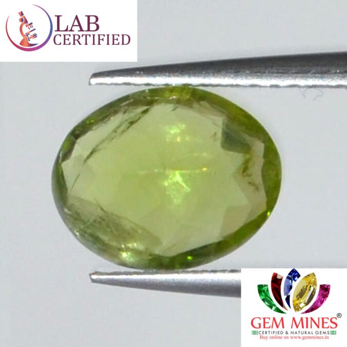 Beautiful 2.73 Ct. Peridot (Burma Mines) Sava 3 Ratti. Free Horoscope & Free Pundit Ji Advise / Consultation. Original Natural Lab certified gems by IGI GTL / Birth stones / Large Gem Selection of shree shubh Rashi Ratan Vedic dhan at Gem Mines. May Bhagwan Brahma, Vishnu, Shiv & Universe bless you.