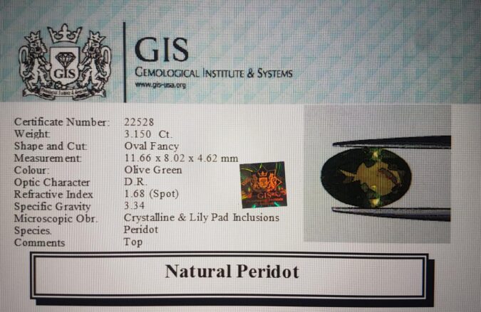 Beautiful 3.15 Ct. Peridot (Burma Mines) Sava 3 Ratti. Free Horoscope & Free Pundit Ji Advise / Consultation. Original Natural Lab certified gems by IGI GTL / Birth stones / Large Gem Selection of shree shubh Rashi Ratan Vedic dhan at Gem Mines. May Bhagwan Brahma, Vishnu, Shiv & Universe bless you.