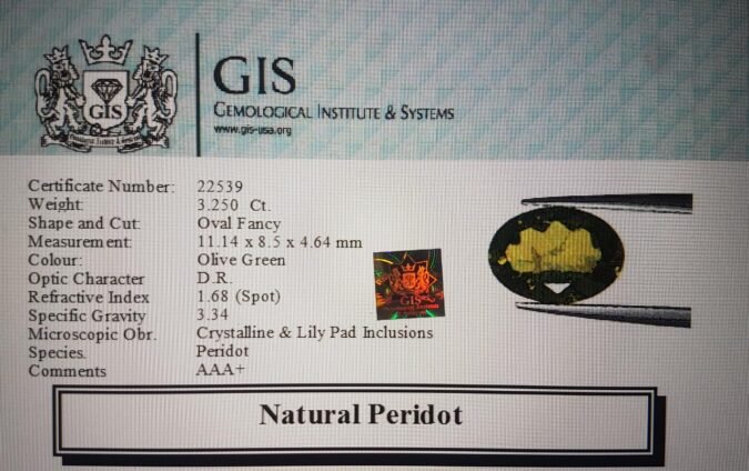 Beautiful 3.25 Ct. Peridot (Burma Mines) Sava 3 Ratti. Free Horoscope & Free Pundit Ji Advise / Consultation. Original Natural Lab certified gems by IGI GTL / Birth stones / Large Gem Selection of shree shubh Rashi Ratan Vedic dhan at Gem Mines. May Bhagwan Brahma, Vishnu, Shiv & Universe bless you.