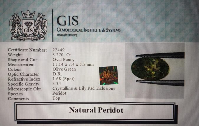 Beautiful 3.27 Ct. Peridot (Burma Mines) Sava 3 Ratti. Free Horoscope & Free Pundit Ji Advise / Consultation. Original Natural Lab certified gems by IGI GTL / Birth stones / Large Gem Selection of shree shubh Rashi Ratan Vedic dhan at Gem Mines. May Bhagwan Brahma, Vishnu, Shiv & Universe bless you.