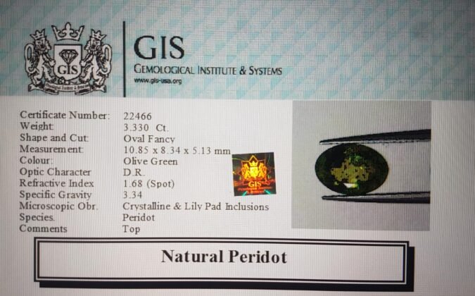 Beautiful 3.33 Ct. Peridot (Burma Mines) Sava 3 Ratti. Free Horoscope & Free Pundit Ji Advise / Consultation. Original Natural Lab certified gems by IGI GTL / Birth stones / Large Gem Selection of shree shubh Rashi Ratan Vedic dhan at Gem Mines. May Bhagwan Brahma, Vishnu, Shiv & Universe bless you.