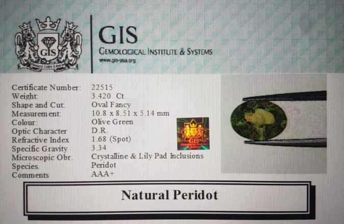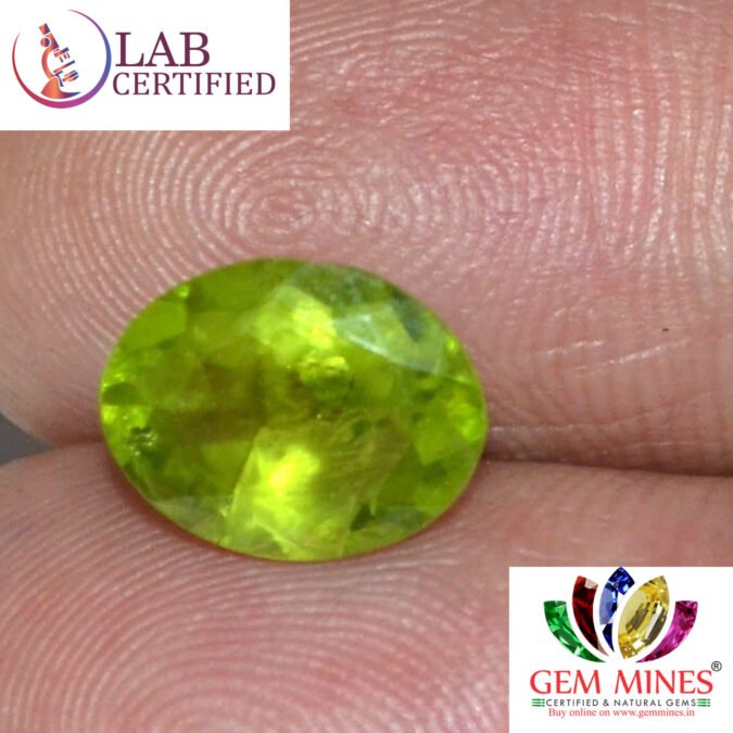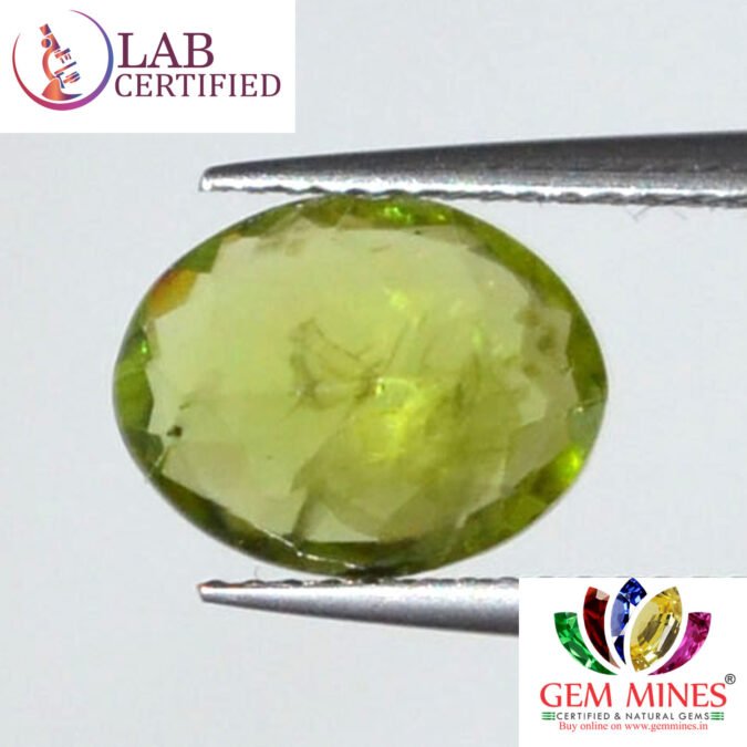 Beautiful 3.42 Ct. Peridot (Burma Mines) Sava 3 Ratti. Free Horoscope & Free Pundit Ji Advise / Consultation. Original Natural Lab certified gems by IGI GTL / Birth stones / Large Gem Selection of shree shubh Rashi Ratan Vedic dhan at Gem Mines. May Bhagwan Brahma, Vishnu, Shiv & Universe bless you.