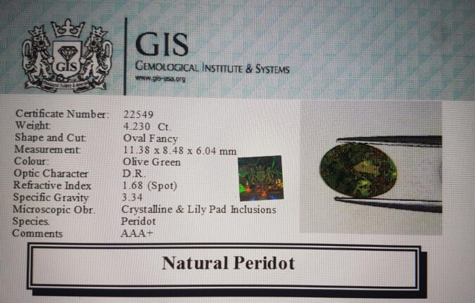 Beautiful 4.23 Ct. Peridot (Burma Mines) Sava 4 Ratti. Free Horoscope & Free Pundit Ji Advise / Consultation. Original Natural Lab certified gems by IGI GTL / Birth stones / Large Gem Selection of shree shubh Rashi Ratan Vedic dhan at Gem Mines. May Bhagwan Brahma, Vishnu, Shiv & Universe bless you.