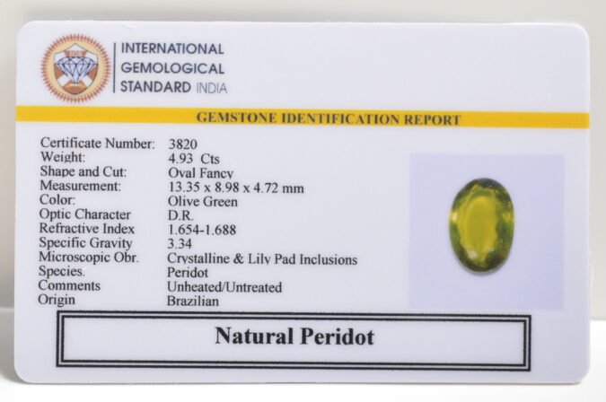 Beautiful 4.93 Cts Natural Peridot (AAA+-Mines) sva 5+ Ratti PERIDOT. Free Horoscope & Free Pundit Ji Astrological Advise / Consultation. Original Natural Lab certified gems by IGI GTL / Birth stones / Large Gem Selection of shree shubh Rashi Ratan Vedic dhan at Gem Mines. May Bhagwan Brahma, Vishnu, Shiv & Universe bless you.