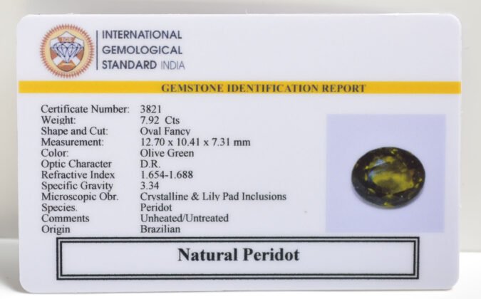 Beautiful 7.92 Cts Natural Peridot (Top++-Mines) sva 8+ Ratti PERIDOT. Free Horoscope & Free Pundit Ji Astrological Advise / Consultation. Original Natural Lab certified gems by IGI GTL / Birth stones / Large Gem Selection of shree shubh Rashi Ratan Vedic dhan at Gem Mines. May Bhagwan Brahma, Vishnu, Shiv & Universe bless you.