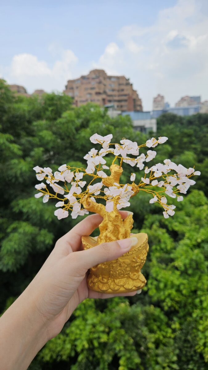 Rose Quartz Golden Tree. Handcrafted with genuine rose quartz crystal chips, each branch is delicately wired with elegant golden metal, creating a beautiful balance of spiritual energy and luxury décor.